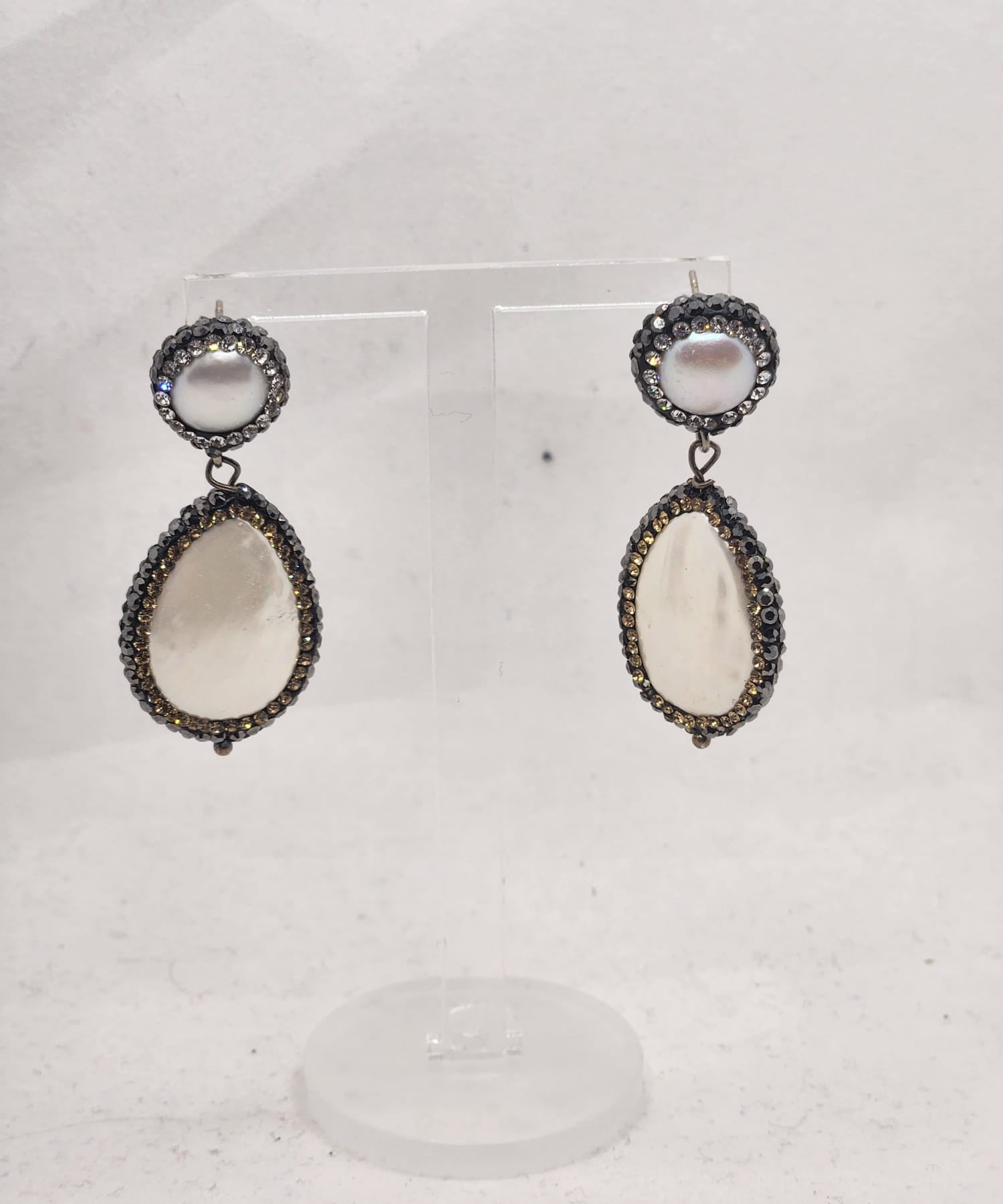 Refined elegance meets bold design in the Noir Éclat Pearl Earrings. Each teardrop-shaped mother-of-pearl is framed by a halo of black pavé crystals, creating a luminous contrast that catches every flicker of light. The top stud features a radiant pearl center, completing the look with understated luxury.